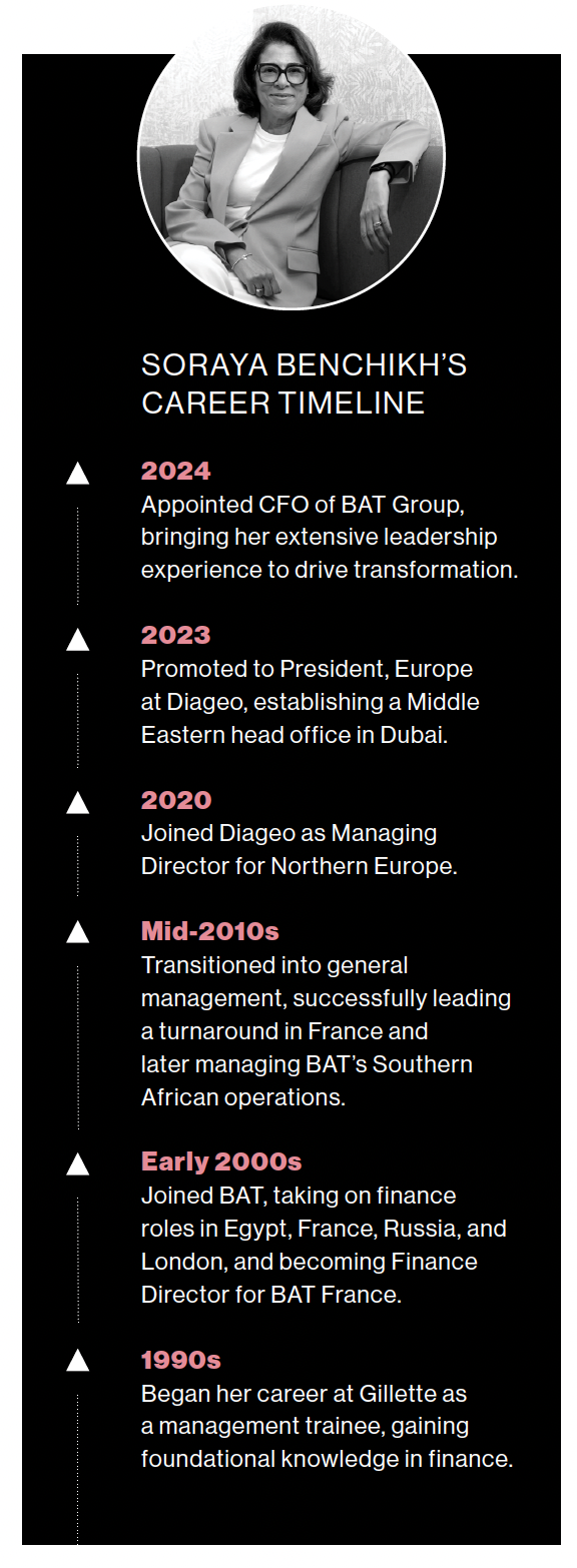 Home GCC Meet Soraya Benchikh: The CFO driving BAT’s global growth and inclusion BAT has transformed into a multi-category consumer goods business, and Benchikh is a key figure driving this change. by Gareth van Zyl March 20, 2025 Follow us Follow on Google News Follow on Facebook Follow on Instagram Follow on X Follow on LinkedIn BAT Group’s Chief Financial Officer, Soraya Benchikh. Sipping her coffee in a modern, well-appointed office on the 39th floor of BAT’s Dubai headquarters, with the city’s iconic skyline stretching out below, Soraya Benchikh exudes calm, approachability, and poise. As BAT Group’s Chief Financial Officer, Benchikh was in Dubai on a brief business trip in January, connecting with staff and overseeing operations. Based in the UK, Benchikh has been in her current role for eight months. Yet, she is no stranger to BAT, having spent over two decades with the company before a high-profile stint as President of the European region at beverage giant Diageo. In the buzzing Dubai offices, the excitement was palpable as staff and senior leaders gathered for meetings and events organised to mark her visit. If you didn’t know her story, you might not guess the immense journey that has brought Benchikh to this point. Raised in Beirut during the turbulent 1980s, she and her family fled to Europe as refugees. “I ended up in Europe as a refugee. I went to school there for a few years and later attended university to study my passion — mathematics. I didn’t overthink it; I just pursued what I enjoyed,” she recalls. The challenges of displacement taught her resilience and adaptability. After graduating, she faced the uncertainty of life on a refugee visa. Benchikh saw the chance to return to a company she knew intimately while embracing a fresh challenge as CFO during a pivotal period. “I needed to find a job, and at a career fair, I came across a stand for accountancy and thought I’d give it a shot. That’s how I joined a management trainee programme at Gillette,” she explains. This first role proved to be a critical launchpad for her career. Early in her professional life, Benchikh excelled in finance, taking on foundational roles that demonstrated her leadership potential. A move to General Electric expanded her horizons as she travelled extensively, leading system implementation projects. She then joined Rothmans just before its merger with BAT, where her career trajectory accelerated. “At Rothmans, a year later, the merger with BAT happened. I started my career in finance as a qualified accountant, and my first finance director role was in North Africa. This was particularly exciting as it was my first professional role in the Middle East,” she says. In Cairo, she was immersed in Middle Eastern business cultures while managing diverse challenges. “The role offered incredible diversity: starting up a business in Egypt, bidding for the Moroccan monopoly, managing a joint venture in Tunisia, and overseeing market entry in Algeria. It was an incredible experience,” she adds. Turnaround Expert During her regional finance role, she noticed how closely finance and general management intersected at BAT, sparking her desire to transition into general management. Her first such opportunity came in France, where she turned around a struggling company in just three and a half years. Building on this success, she was promoted to lead one of BAT’s largest businesses in the Southern African region, based in Cape Town and Johannesburg. This role brought complex challenges, including collaboration with governments to address trade issues. Again, her leadership transformed the company’s performance, earning it a Group award after four years. Her reputation as a transformative leader led to her recruitment by Diageo, where she took on the role of Managing Director for Northern Europe, overseeing 11 countries from a base in Hamburg, Germany. Taking on this role during the COVID-19 pandemic posed unique challenges. “The pandemic was a period of immense learning for me,” she reflects. “Navigating a new industry remotely taught me the importance of resilience and collaboration.” Despite these hurdles, her fresh perspective helped identify market opportunities and capitalise on shifts in consumer behaviour, resulting in significant business growth. After two and a half years, her achievements earned her a promotion to Diageo’s executive committee as President for Europe. In this capacity, she spearheaded the establishment of Diageo’s Middle Eastern head office in Dubai, which became one of the group’s fastest-growing units. Driving Inclusion and Empowerment at BAT Soraya Benchikh is fully committed to BAT’s transformative journey, and she is highly supportive of ensuring diversity, equity, and inclusion (DEI) within the organisation. She firmly believes in the power of inclusivity to create a thriving workplace. “At BAT, diversity, equity, and inclusion are at the heart of our values. These principles drive initiatives designed to help women excel and advance into leadership and management roles,” she shares. To nurture a truly inclusive culture, BAT has implemented key initiatives such as “Women in BAT,” “Women in STEM,” and “Women in Leadership.” These programmes provide mentorship, training, and essential resources to empower women in industries where they have historically been underrepresented. Highlighting the measurable impact of these initiatives, Soraya explains, “By 2025, we aim to have women make up 40 per cent of senior leadership teams and 45 per cent of management roles. Programmes like Women in Leadership, which now supports around 1,000 female managers, are accelerating careers and creating lasting impact.” A Leadership Style Shaped by Heritage Soraya Benchikh’s Middle Eastern heritage has profoundly shaped her leadership philosophy. “As a Lebanese woman with extensive experience working for leading corporat