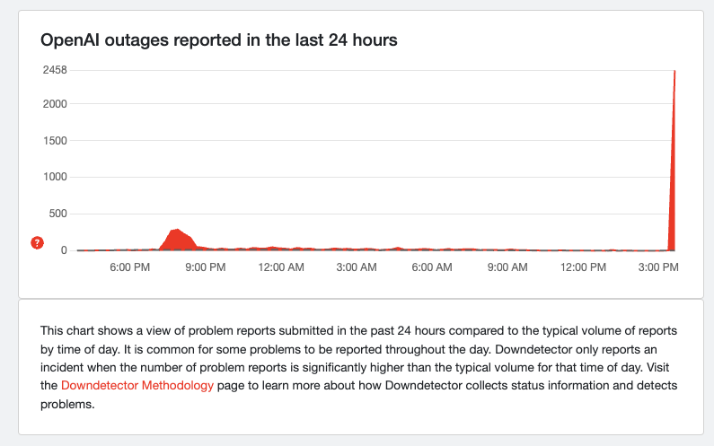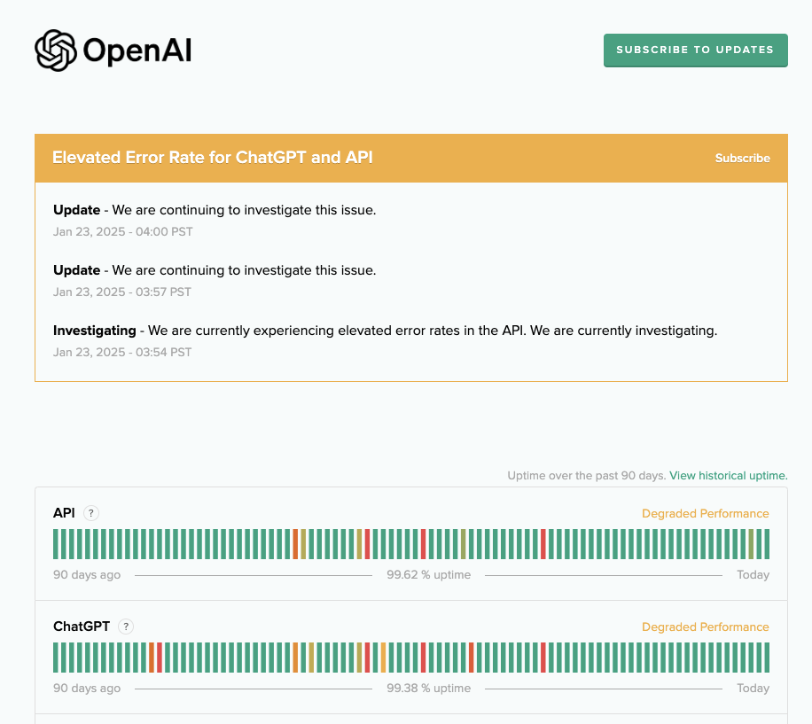 Home Industry Technology ChatGPT suffers fresh outage as downtime reports spike This marks the second time in recent months that ChatGPT has experienced downtime by Gareth van Zyl January 23, 2025 Follow us Follow on Google News Follow on Facebook Follow on Instagram Follow on X Follow on LinkedIn UPDATE: OpenAI says all its systems are operational again after a brief outage occurred The world’s most popular AI tool, ChatGPT, experienced brief downtime on Thursday afternoon, according to website outage reporting tool Downdetector.com. At the time of writing, OpenAI has not disclosed the reasons for the outage. This marks the second time in recent months that ChatGPT has experienced downtime. On December 12, 2024, an outage impacted OpenAI’s newly launched Sora AI model, which enables users to create videos from text prompts. In a recent update regarding the outage on Thursday afternoon, OpenAI said: “The issue has been identified and a fix is being implemented.” OpenAI’s operating status indicated an elevated level of error reporting on Thursday afternoon. READ MORE: ChatGPT experiences global outage as OpenAI works on fix A message that appeared on some ChatGPT users’ screens on Thursday afternoon. With an estimated 123 million daily active users, ChatGPT has become one of the most widely used generative AI applications globally. Initially released in late 2022, the tool quickly gained traction, amassing over one million users within 24 hours of launch. Downdetector.com reported a spike in outage reports on Thursday afternoon. *This is a developing story. Tags ChatGPT downtime OpenAI