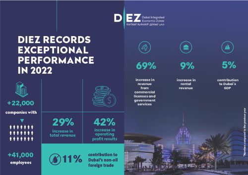 Dubai Integrated Economic Zones (DIEZ)  Authority has announced a 42 per cent increase in its operating profit in 2022. The authority said its total revenue increased by 29 per cent, compared to 2021.