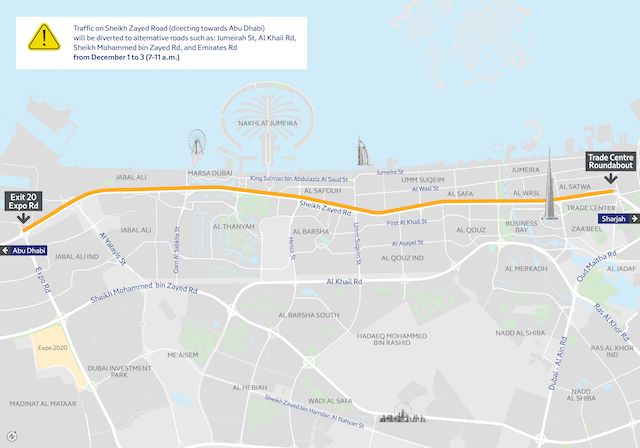 Home UAE Dubai COP28: Sheikh Zayed Road closure from Friday; what you need to know The temporary road closure will occur between the Trade Centre Roundabout towards the Expo Intersection, and will occur during the start of COP28 by Gulf Business November 29, 2023 Follow us Follow on Google News Follow on Facebook Follow on Instagram Follow on X Follow on LinkedIn Image Road users won’t be able to travel on Sheikh Zayed Road — towards Abu Dhabi — from 1 – 3 December, between 07:00 – 11:00. The temporary road closure will occur between the Trade Centre Roundabout towards the Expo Intersection, according to Dubai’s Roads and Transport Authority (RTA). The closures will coincide with the UAE’s Union Day celebrations as well as the hosting of COP28. The UN climate summit officially kicks off on November 30, with it concluding on December 12. How the road closure will be managed READ: Explainer: What’s the plan for this year’s COP28 summit The RTA says that it, together with Dubai Police, has mapped out a traffic plan to ensure smooth traffic flows during this period. As a result, alternative roads such as the Sheikh Mohammed bin Zayed Road, Sheikh Zayed bin Hamdan Al Nahyan Road, Emirates Road, Al Khail Road, Jumeirah Road, Al Wasl Road, and Al Khail Road will cater to road users. RTA is further advising the public to use public transportation for their commutes. Read: COP28 – How you can visit world’s key sustainability conference READ MORE: UAE announces 3-day weekend for public, private sectors Source: Dubai’s RTA Tags COP28 Sheikh Zayed Road Union Day