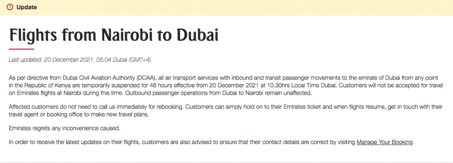 Home UAE Dubai Dubai temporarily suspends flights from Kenya – Emirates Emirates says inbound flights from Kenya for will be suspended for 48 hours effective from Monday by Aarti Nagraj December 20, 2021 Follow us Follow on Google News Follow on Facebook Follow on Instagram Follow on X Follow on LinkedIn Dubai airline Emirates has announced that it is temporarily suspending all flights from Kenya for 48 hours effective from Monday, December 20, at 10.30am Dubai time. The decision was taken in line with a new directive issued by the Dubai Civil Aviation Authority (DCAA), Emirates said on its website. The DCAA directive applies to all “air transport services” with inbound and transit passenger movements to Dubai from any point in Kenya temporarily banned. “Customers will not be accepted for travel on Emirates flights at Nairobi during this time. Outbound passenger operations from Dubai to Nairobi remain unaffected,” the airline said. No reason was given for the new directive. Affected passengers can hold on to their Emirates ticket and when flights resume, get in touch with their travel agent or booking office to make new travel plans. “Emirates regrets any inconvenience caused,” it added. The move comes after the UAE cancelled flights from Congo last week and also announced new restrictions for passengers coming from four other African nations including Nigeria, Kenya, Rwanda and Ethiopia. Read: UAE suspends all flights from Congo, announces new travel rules for four other African countries Countries worldwide are grappling to control the rapid spread of the new Covid-19 variant omicron, which was first detected in South Africa. Tags Aviation Dubai Emirates flights Kenya suspension 0 Comments