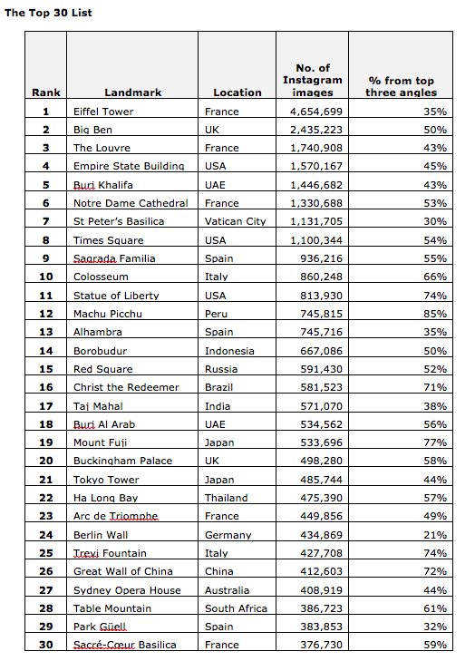 Sony Mobile and OnePoll revealed the findings as part of a study of the top 30 most photographed locations in the world conducted earlier this month.