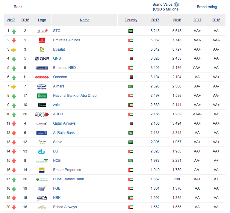 Home Transport Aviation Saudi’s STC beats Emirates to rank as Middle East’s most valuable brand Emirates had led the Brand Finance top 50 list since 2010 by Robert Anderson April 10, 2017 Follow us Follow on Google News Follow on Facebook Follow on Instagram Follow on X Follow on LinkedIn Dubai carrier Emirates has lost its position as the most valuable brand in the Middle East in a ranking by Brand Finance. The firm said Emirates had led the top 50 list since its conception in 2010 but there was a dramatic shift in 2017. (Scroll down for the top 20). The brand value of the carrier dipped 21 per cent to $6.1bn, meaning it lost its top place to Saudi Telecom Company (STC) on a regional level while globally it was even overtaken by US carriers American, United and Delta, according to the firm. “Last year, Emirates’ half-year profits plunged 75 per cent. The lower oil price has levelled the playing field for international rivals, leading to increased competition, driving down fares,” said Brand Finance CEO David Haigh. “The discount rate applied to all Gulf airlines has increased in tandem with this less favourable environment, reducing long term value. Finally, the strength of the dollar has increased operating costs and also had a negative FX impact on all non-US domiciled brands.” Emirates’ gulf airline rivals Etihad and Qatar Airways fared even worse, with the former dipping from 16th to 20th and the latter fourth to 11th. In the 2017 list, STC’s brand value increased 11 per cent to $6.2bn, reflecting what Brand Finance Middle East managing director Andrew Campbell described as the firm’s departure “from its once traditional approach”. “A clear indication of its success is the five-point increase in its brand strength index score, proving that putting some heart into it pays off,” he said. In the wider Middle East list, Saudi Arabia was represented by 18 companies to the UAE’s 17 – down from 21 last year. However, the kingdom continued to lag behind the UAE in total brand value, with the UAE accounting for 44 per cent of the top 40 to Saudi’s 32 per cent. Qatar’s brand value has also grown with its representation standing at eight brands, compared to Kuwait’s four. Oman was represented by just one brand Omantel – which rose from 47th to 45th with 4 per cent brand value growth, while Jordan and Lebanon also re-entered the list through Arab Bank and Bank Audi, valued at $382m and $368m respectively. Bahrain was the only GCC country that did not feature with Ahli United Bank growing from $252m to $296m, just short of the $358m threshold. 0 Comments
