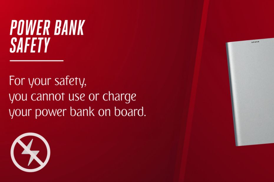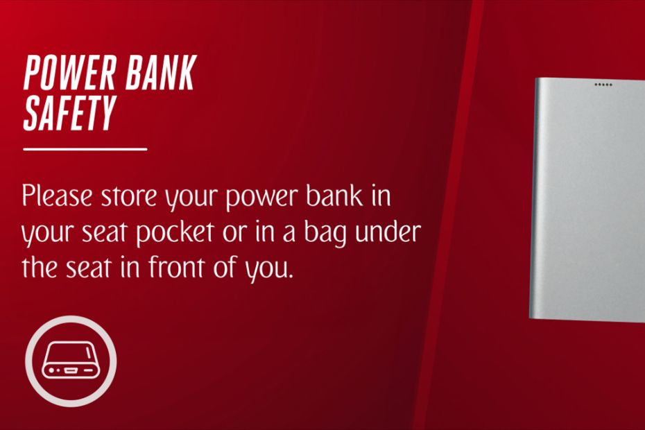 • Power banks must display capacity information and cannot be placed in overhead bins.
