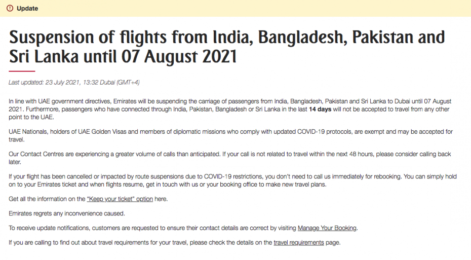 Home Transport Aviation Emirates says flight ban from India, Pakistan, Bangladesh and Sri Lanka extended to Aug 7 Passengers who have connected through the four countries in the last 14 days will also not be accepted to travel by Aarti Nagraj July 28, 2021 Follow us Follow on Google News Follow on Facebook Follow on Instagram Follow on X Follow on LinkedIn Dubai airline Emirates has again pushed the start of passenger flights from India, Pakistan, Bangladesh and Sri Lanka. The carrier announced on Wednesday, July 28 that flights from the four countries will remain suspended until August 7. “In line with UAE government directives, Emirates will be suspending the carriage of passengers from India, Bangladesh, Pakistan and Sri Lanka to Dubai until 7 August 2021,” it said. “Furthermore, passengers who have connected through India, Pakistan, Bangladesh or Sri Lanka in the last 14 days will not be accepted to travel from any other point to the UAE.” The airline added that UAE nationals, holders of UAE golden visas and members of diplomatic missions who comply with updated Covid‑19 protocols are exempt and may be accepted for travel. Emirates also stressed that passengers whose flights have been cancelled or impacted by route suspensions due to Covid‑19 restrictions, can hold on to their tickets and when flights resume, they can get in touch with Emirates to change the booking. “Emirates regrets any inconvenience caused,” it stated. The ban on flights from the four nations has been extended several times in the last few weeks. Flights from India to the UAE were originally suspended from April 24 due to the surge in Covid-19 infection in the country. Meanwhile flights from Pakistan, Bangladesh, Nepal and Sri Lanka were suspended on May 13. Tags Aviation Bangladesh Covid-19 Dubai Emirates flights India Pakistan Sri Lanka 0 Comments