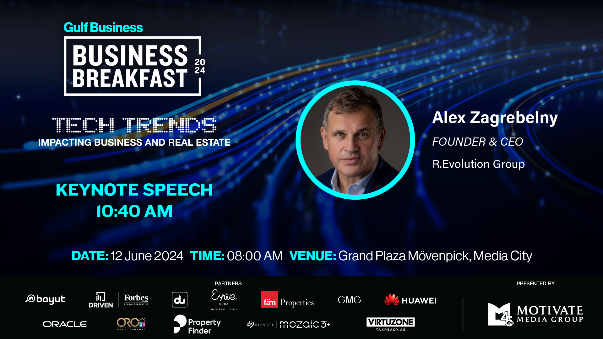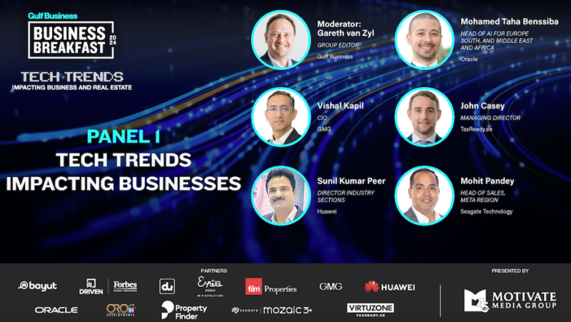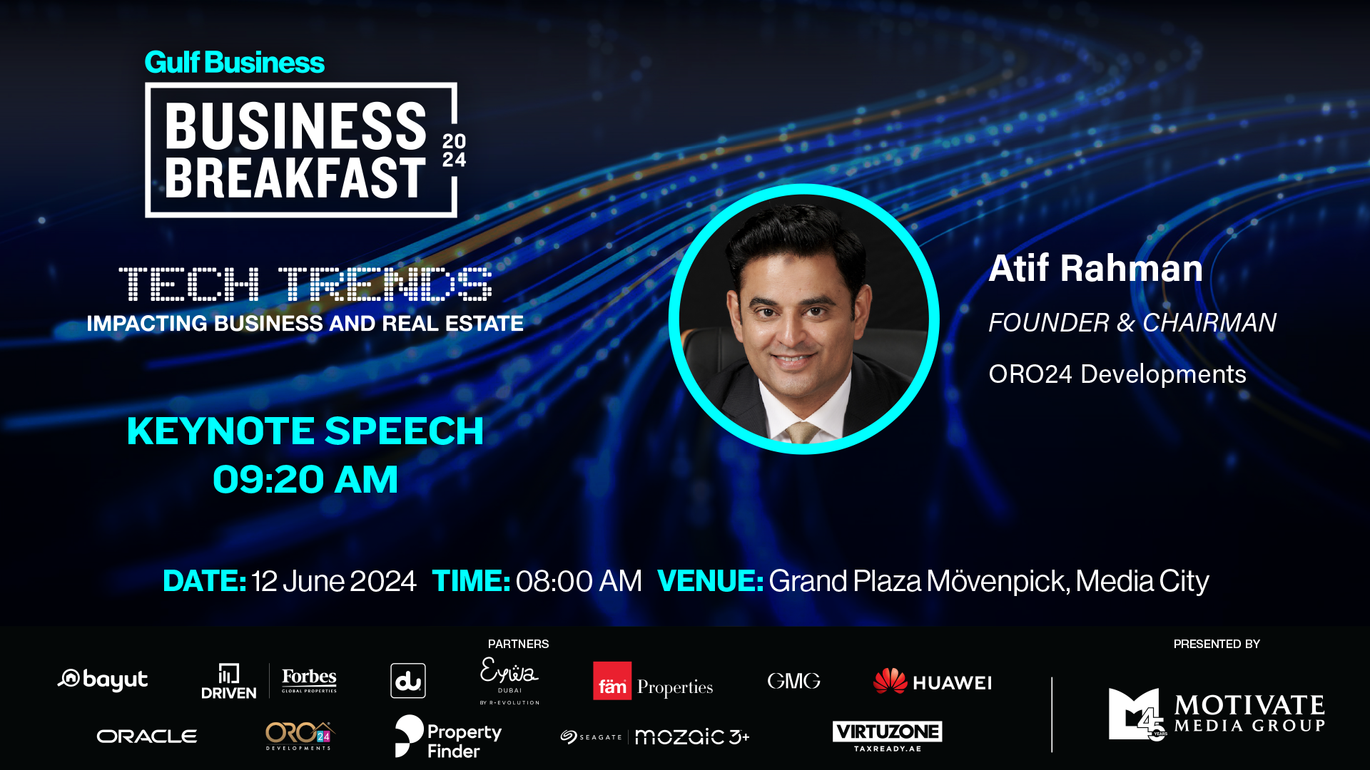 Gulf Business Panel: Tech Trends impacting Business and Real Estate When: June 12, 2024 8:00 am Where: Grand Plaza Mövenpick, Media City The GCC’s longest-running and most established business publication, Gulf Business, is hosting a technology-themed panel on 12 June 2024 where top experts from an array of fields will converge to discuss the latest trends impacting the worlds of finance, banking, real estate, construction and much more. From the latest developments in artificial intelligence to cybersecurity and fintech; join us for lively discussions and debate that will help keep you ahead of the curve. Led by Gulf Business’ editorial team, the panel sessions will provide audience members with an opportunity to engage with our top experts and network with industry leaders. The panelists will come from various top companies, including Bayut.com, Property Finder, Huawei, and Oro24, among many others. These panels will provide audience members the opportunity to ask questions of the panelists, while engaging in what will be a fascinating discussion. Be sure to RSVP and join us for what will be an exciting event. When: 12/06/2024 8:00 am Where: Grand Plaza Mövenpick, Media City Please check out the event photo gallery here Event Agenda: 08:00am: Registration & Networking Breakfast 09:00am: Opening speeches from the Gulf Business Team 09:20am: Keynote speech by Atif Rahman, Founder & Chairman of ORO24 Developments 09:30am: Panel 1: Tech Trends impacting Businesses The Gulf Business tech panel, entitled ‘Tech Trends impacting Businesses’, will take a deep dive into how the latest technological advancements are changing the business and investment landscape in the region. Participants will discuss how the region’s businesses are changing, how artificial intelligence is affecting a wide array of industries, and how cybersecurity is becoming more of a concern for businesses with rapid AI deployments. The panel will further look at how and where blockchain technology is making an impact. The confirmed key speakers on this panel will include: Gareth van Zyl, Group Editor, Gulf Business (Moderator) Mohamed Taha Benssiba, Head of AI for Europe South, and Middle East and Africa, Oracle Vishal Kapil, CIO of GMG John Casey, Managing Director, TaxReady.ae (Virtuzone) Sunil Kumar Peer, Director Industry Sections, Huawei Mohit Pandey, Head of Sales, META region, Seagate Technology 10:15am: Q&A 10:25am: Keynote speech by Firas Al Msaddi, CEO & Founder of fäm Properties 10:35am: Break 10:40am: Keynote speech by Alex Zagrebelny, Founder & CEO, R.Evolution Group 10:50am: Panel 2: Impact of PropTech on Real Estate The Gulf Business PropTech panel, will look at the ‘Impact of PropTech on the regional real estate, construction sectors’ This panel session will take a closer look at the role that PropTech plays in the regional real estate and construction sectors. Experts in the fields of real estate and PropTech will talk about everything from automation to artificial intelligence, the internet of things, and much more. The confirmed key speakers on this panel will include: Atif Rahman, Founder & Chairman of ORO24 Developments (Moderator) Firas Al Msaddi, CEO & founder of fäm Properties Alex Zagrebelny, Founder & CEO, R.Evolution Group Fibha Ahmed, Vice President of Property Sales, Bayut & dubizzle Louai Abou Khzam, Co-Founder of Prosper Real Estate 11:35am: Q&A 11:45am: Closing notes by Gareth van Zyl, Group Editor of Gulf Business For partnership and sponsorship opportunities, please email Manish Chopra [email protected]