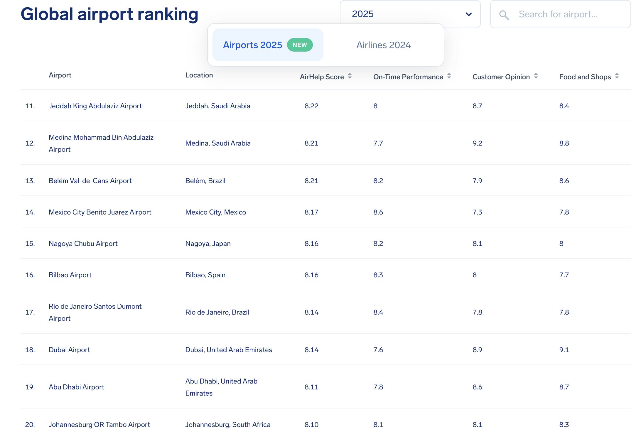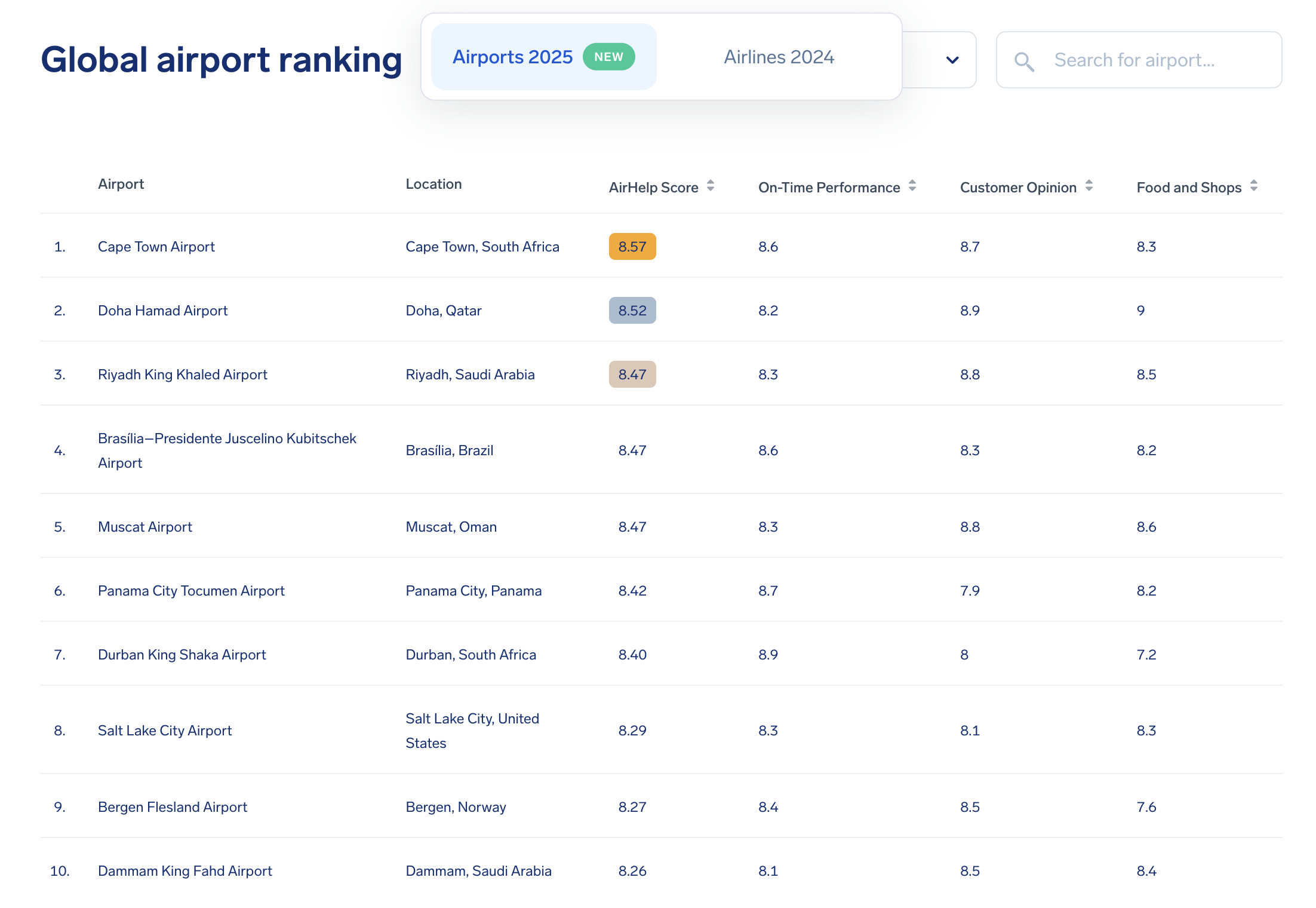 Home UAE Abu Dhabi 2025 ranks: These are the best airports in GCC The United Arab Emirates and Qatar lead the GCC in international air traffic, bolstered by world-class carriers like Emirates and Qatar Airways by Nida Sohail July 10, 2025 Follow us Follow on Google News Follow on Facebook Follow on Instagram Follow on X Follow on LinkedIn Image credit: WAM/Website The world’s best airports have been ranked for 2025, highlighting top performers in overall passenger experience, service quality, and infrastructure. Leading the global list is Cape Town International Airport in South Africa, scoring an impressive 8.57 out of 10. Not far behind is Doha Hamad International Airport in Qatar, with a strong score of 8.52. Riyadh King Khaled International Airport in Saudi Arabia secured third place with 8.47. These airports have been recognised for excellence in facilities, service, and overall passenger satisfaction. Read- Dubai’s DXB eyes real estate future after DWC takeover Airports in the Gulf Cooperation Council (GCC)—which includes Bahrain, Kuwait, Oman, Qatar, Saudi Arabia, and the United Arab Emirates—play a vital role in global and regional connectivity. Over recent years, these nations have made strategic investments in aviation infrastructure to support economic diversification, tourism growth, and logistics development. The region is home to major hubs such as Dubai International Airport (DXB), Doha Hamad International Airport (DOH), and King Khalid International Airport (RUH) in Riyadh, each renowned globally for their capacity, innovation, and premium passenger services. The United Arab Emirates and Qatar lead the GCC in international air traffic, bolstered by world-class carriers like Emirates, Etihad Airways, and Qatar Airways. Saudi Arabia is rapidly expanding its aviation sector as part of its Vision 2030 plan, aiming to transform Riyadh into a major global transit hub. Meanwhile, Oman and Bahrain are steadily upgrading their airports to attract more tourists and boost regional competitiveness. GCC airports are notable for integrating advanced technologies, luxury amenities, and streamlined operations that serve millions of travelers annually. Additionally, these airports are critical cargo gateways connecting Asia, Europe, and Africa. With ongoing investments and expansions, GCC airports are set to maintain their pivotal role in global aviation, reinforcing the region’s position as an essential link in international air travel and commerce. AirHelp airport rankings highlight GCC strength According to the 2025 AirHelp airport ranking report, several GCC airports earned high marks across categories such as customer opinion, food and shopping, and on-time performance. Dubai International Airport scored 8.14 overall, standing out with exceptional food and shopping options rated 9.1 and a strong customer opinion score of 8.9. Abu Dhabi International Airport also performed well with an overall score of 8.11, backed by favorable ratings in customer satisfaction (8.6) and amenities (8.7). These scores underline the UAE’s competitive edge in delivering superior passenger experiences through quality service and diverse offerings. Doha Hamad International Airport leads the GCC with a remarkable overall score of 8.52. The airport received high marks for customer opinion (8.9) and food and shopping (9.0), reinforcing its reputation as a world-class facility. Riyadh King Khaled International Airport and Muscat International Airport in Oman tied with scores of 8.47. Riyadh was praised for its customer satisfaction rating of 8.8 and consistent performance across categories, while Muscat excelled in food and shopping (8.6) and maintained solid scores in customer satisfaction (8.8) and punctuality (8.3). Dammam’s King Fahd International Airport scored 8.26 overall, with an 8.1 rating for on-time performance, 8.5 for customer opinion, and 8.4 for food and shopping. Jeddah’s King Abdulaziz International Airport posted a strong 8.22, supported by steady marks in punctuality (8.0), customer opinion (8.7), and amenities (8.4). Medina’s Mohammad Bin Abdulaziz Airport followed closely with 8.21, excelling in customer opinion (9.2) and food and shopping (8.8). These rankings highlight the consistent quality and service excellence across the Gulf’s major airports, reflecting broader regional ambitions in aviation. Best airports by flight volume The rankings also recognize the top airports based on annual flight volumes: Over 250,000 flights per year: Doha Hamad International Airport tops the list, earning an 8.52 rating. Known for its cutting-edge facilities and luxury services, it serves as a global benchmark in passenger experience. 125,000 to 250,000 flights: Panama City’s Tocumen Airport in Panama scored 8.42, reflecting its status as a key Latin American hub with efficient connections and solid service quality. 65,000 to 125,000 flights: Cape Town International Airport in South Africa leads this category with 8.57, praised for cleanliness, easy navigation, and traveler satisfaction. Under 65,000 flights: Durban’s King Shaka International Airport ranks highly with 8.40, recognized for modern infrastructure and smooth operations. Each airport shines within its size category, delivering tailored services that meet the demands of their respective passenger volumes. Top airports by region The global best airports by region demonstrate distinct strengths: Africa: Cape Town International Airport leads with 8.57. Asia: Nagoya Chubu Airport tops the list with an 8.16 rating. Europe: Bergen Flesland Airport stands out at 8.27. Middle East: Doha Hamad International Airport impresses with 8.52. North America: Panama City Tocumen Airport earns an 8.42. Oceania: Gold Coast Airport leads with 7.86. South America: Brasília–Presidente Juscelino Kubitschek Airport is recognized as the top airport, though its exact score was not specified. Tags 2024 Abu Dhabi airport AirHelp ranking AUH airpo