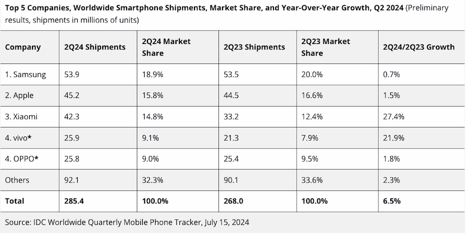 According to preliminary data from the International Data Corporation (IDC) Worldwide Quarterly Mobile Phone Tracker, global smartphone shipments rose 6.5 per cent year-over-year to 285.4 million units in Q2 2024.