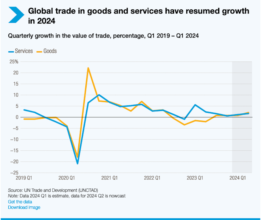 Home Industry Global trade sees growth in Q1 2024, shares UNCTAD Trade in developing countries and South-South trade increased by about 2 per cent in both imports and exports during the first quarter by Gulf Business July 4, 2024 Follow us Follow on Google News Follow on Facebook Follow on Instagram Follow on X Follow on LinkedIn Image: Getty Images Global trade trends turned positive in the first quarter of 2024, with the value of trade in goods increasing by approximately 1 per cent quarter-over-quarter and services by about 1.5 per cent, according to the latest Global Trade Update released by UN Trade and Development (UNCTAD) on July 2. The trade growth was primarily driven by significant increases in exports from China (9 per cent), India (7 per cent), and the US (3 per cent). Conversely, Europe’s exports showed no growth, and Africa’s exports decreased by 5 per cent. UNCTAD‘s report anticipates that this increase will add approximately $250bn to trade in goods and $100bn to services trade in H1 2024 compared to H2 2023. The short-term trade outlook remains cautiously optimistic as global GDP growth forecasts are steady at around 3 per cent for 2024. The report suggests that if these positive trends persist, global trade in 2024 could reach almost $32tn, although it is unlikely to surpass the record levels seen in 2022. Graph: UNCTAD South-South trade rises Trade in developing countries and South-South trade increased by about 2 per cent in both imports and exports during Q1. In contrast, developed countries saw flat imports and a modest 1 per cent rise in exports. While South-South trade rose by 2 per cent, its value remains significantly below 2022 levels, with its four-quarter moving average still negative at -5 per cent. Clean energy, AI do well, reveals UNCTAD report The report highlights significant trade growth in the green energy and artificial intelligence sectors. The trade value of high-performance servers rose by 25 per cent compared to the first quarter of 2023, while other computers and storage units saw an 8 per cent increase. The trade value of electric vehicles also grew by about 25 per cent between 2022 and 2023. Geopolitical challenges, policies have an impact Despite these positive trends, the outlook for 2024 is tempered by potential geopolitical issues and industrial policy impacts. The report notes that geopolitical tensions, rising shipping costs, and emerging industrial policies could reshape global trade patterns. Since late 2022, there has been an uptick in “friend-shoring,” favouring countries with similar geopolitical stances. Although this trend has begun to soften, the report warns that an increasing focus on domestic industries and trade restrictions could hinder international trade growth. Tags Global trade stats highlights q1 2024 UNCTAD