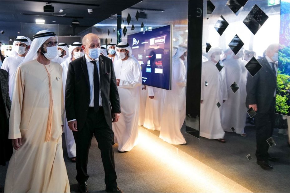 Home Expo 2020 In pics: Sheikh Mohammed tours Expo 2020 site, visits country pavilions Expo 2020 Dubai opened to the public on October 1 by Staff writer October 3, 2021 Follow us Follow on Google News Follow on Facebook Follow on Instagram Follow on X Follow on LinkedIn Sheikh Mohammed bin Rashid Al Maktoum, Vice President and Prime Minister of the UAE and Ruler of Dubai, toured the Expo 2020 site on Saturday and visited some of the country pavilions. He also met with Jean-Yves Le Drian, France’s Minister for Europe and Foreign Affairs, during his visit to the French pavilion. The two leaders discussed ways to enhance cooperation between the two countries following the recent meeting of Abu Dhabi Crown Prince Sheikh Mohamed bin Zayed Al Nahyan with French President Emmanuel Macron in Paris. .@HHShkMohd meets with Jean-Yves Le Drian, France’s Minister for Europe and Foreign Affairs, during his visit to the French pavilion at @expo2020dubai.https://t.co/mpgp183iHR pic.twitter.com/uIJhFz0Fge — Dubai Media Office (@DXBMediaOffice) October 2, 2021 During his visit to the French pavilion located in the Mobility District, Sheikh Mohammed was briefed about the pavilion’s theme ‘France, Lightspeed Inspiration’ (‘France, l’inspiration à la vitesse de la lumière’), which expresses the country’s commitment to building a new economic, social and cultural model around three core values: boldness, optimism and community. The 21-metre-high pavilion is the eighth tallest pavilion at Expo. Its facade and roof are made of 2,500 square metres of solar tiles, producing 60 per cent of the energy it consumes. During the tour, Sheikh Mohammed also visited the pavilions of Saudi Arabia and Oman. The Saudi pavilion, which represents the country’s Vision 2030, is located in the Opportunity District and at over 13,000 square metres, is the second largest pavilion in size at the Expo 2020 Dubai site. During his tour to @expo2020dubai on its second day, @HHShkMohd, accompanied by @HamdanMohammed and @MaktoumMohammed, visited the pavilion of the Kingdom of Saudi Arabia. pic.twitter.com/InTn9uhena — Dubai Media Office (@DXBMediaOffice) October 2, 2021 It takes visitors on a journey across four main pillars: people, nature, heritage and opportunities. Rising six stories above the ground, the pavilion was also designed to showcase the kingdom’s ancient culture, heritage; its natural landscape; and its present and future ambitions. The eco-friendly structure also has solar panels manufactured in the kingdom by Saudi entrepreneurs. Meanwhile the Oman pavilion, located in the Mobility District, is designed based on inspiration from the frankincense tree. Visitors to the pavilion pass through five zones that illuminate how frankincense contributed to Omani advancements in transportation, knowledge, manufacturing, sustainability and exploration. The pavilion also includes a shop, in which more than 2,000 types of goods and products belonging to nearly 400 small and medium enterprises are displayed. .@HHShkMohd, accompanied by @HamdanMohammed and @MaktoumMohammed, visits the pavilion of the Sultanate of Oman at @expo2020dubai, as part of his tour on the world fair’s second day. pic.twitter.com/fPkTy5Fghz — Dubai Media Office (@DXBMediaOffice) October 2, 2021 Held under the theme of ‘Connecting Minds, Creating the Future’, Expo 2020 Dubai opened its doors to the public on October 1 and will continue until March 31, 2022. The world’s biggest in-person event to take place since the start of the pandemic and the first World Expo to be held in the Middle East, Africa and South Asia region, Expo 2020 features the participation of 192 countries highlighting the event’s sub-themes of sustainability, opportunity and mobility. Tags Dubai Expo 2020 France Oman Saudi Arabia Sheikh Mohammed 0 Comments