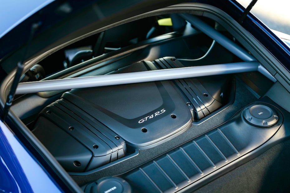The engine is directly lifted from the 911 GT3 and flipped 180 degrees to fit into the GT4 RS’ engine bay.