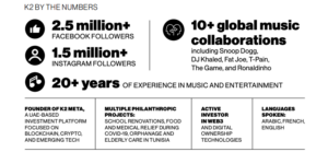 That evolution led to an impressive roll call of global collaborations, from T-Pain to Ronaldinho to The Game. “I’ve worked with Snoop Dogg before, and we’re planning to collaborate again,” K2 teases, “this time with a shared vision of leveraging music, technology, and entrepreneurship to drive social change.”