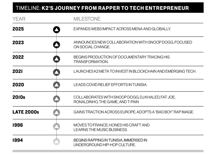If the early K2 was the archetypal ‘bad boy’ of North African rap, the present-day version is polished, sharp, and immersed in frontier technologies. Today, K2 is at the helm of K2 Meta, a tech investment platform focused on blockchain, crypto and next-gen innovation.