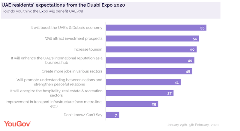 Home Expo 2020 Majority of UAE residents feel Expo 2020 will boost economy – survey As many as 49 per cent feel that the Dubai Expo will enhance the country’s reputation as a business hub while 48 per cent feel it will lead to creation of more jobs by Zainab Mansoor February 10, 2020 Follow us Follow on Google News Follow on Facebook Follow on Instagram Follow on X Follow on LinkedIn A large majority of UAE residents are looking forward to the Expo 2020 event scheduled for later this year, a new survey has found. The survey by YouGov, which polled 1,004 respondents across the UAE, revealed that 67 per cent are keen to visit the mega event in October 2020. More than half (55 per cent) of UAE residents hold the conviction that the event will boost the UAE and Dubai’s economy. Meanwhile, 51 per cent believe that it will attract prospective investments and increase the influx of tourists in the country (50 per cent). As many as 49 per cent feel that Dubai Expo will enhance the country’s reputation as a business hub while 48 per cent feel that it will lead to creation of more jobs. Amongst nationality groups, Arab expats (47 per cent) are most hopeful that the Dubai Expo will galvanise the hospitality, real estate and recreation sectors. However, the survey revealed that awareness around the stipulated mega event is considerably low as only 28 per cent were aware of District 2020, 36 per cent respondents were clueless, and an equal proportion of people had only heard of it but were not entirely sure what it was. Attendee classification Working professionals (72 per cent) are more likely to visit the Expo event than non-working residents (51 per cent) while married people, especially ones with children, are more keen to visit. Older adults, typically aged 30 or more, are more likely to be present than younger adults across the country. Similarly, among those likely to visit, more than half (52 per cent) are planning to attend the Expo show at its launch while 15 per cent are likely to attend the closing ceremony. While two in five individuals will attend specific events, only 10 per cent will join the celebrations after going through attendee reviews. Equally, 10 per cent are currently unsure of their attendance. Among the attendees, many are excited to watch the advent of culture and education (38 per cent each). Gender-wise, a considerable number of men are keen for sporting events (35 per cent) while 41 per cent female attendees are keen to experience architecture (41 per cent) and music (33 per cent) at the event. Most people are likely to visit the mega event on short frequency tickets; as many as 29 per cent prefer the one-day ticket, while 26 per cent respondents are planning to buy the three-day multiple entry ticket leaving 21 per cent and 9 per cent who prefer the monthly and six-month pass respectively. 0 Comments