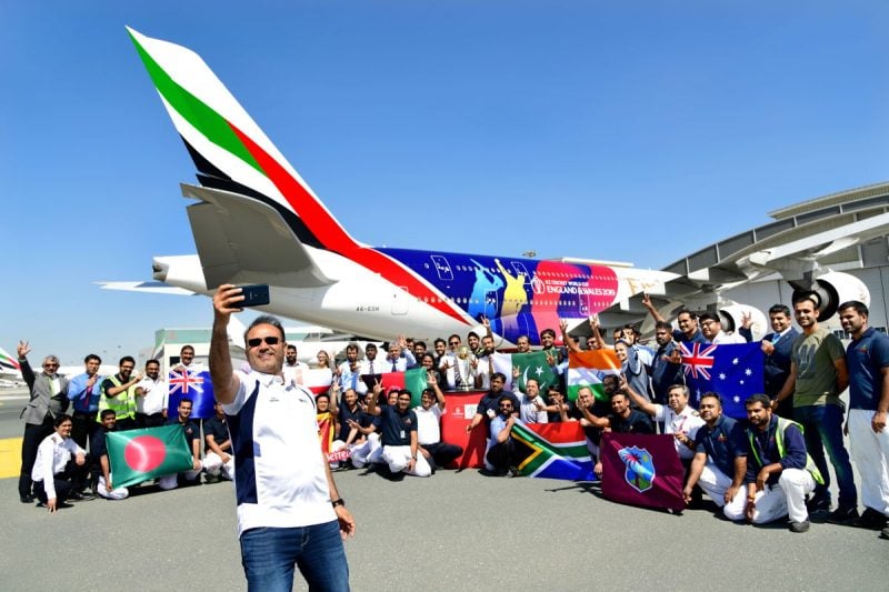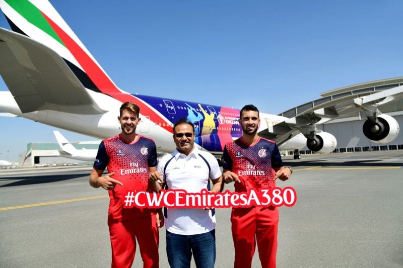 Home Industry Sport Pics: Dubai’s Emirates reveals ICC cricket world cup themed A380 livery The jumbo jet features a decal of the ICC men’s cricket world cup, which runs from May 30 to July 14 this year by Aarti Nagraj March 19, 2019 Follow us Follow on Google News Follow on Facebook Follow on Instagram Follow on X Follow on LinkedIn Dubai airline Emirates has revealed its ICC cricket world cup 2019 themed A380 livery ahead of the sporting events this year. The jumbo jet features a decal of the ICC men’s cricket world cup, which runs from May 30 to July 14 in England and Wales. Former India cricketer Virender Sehwag and Emirates sponsored Lancashire team players Saqib Mahmood and Tom Bailey helped to marshal the aircraft out of the Emirates Engineering hangar, where the decal was installed. The decal covers a substantial area of 694sqm on the Emirates A380 fuselage and includes player silhouettes batting and bowling against a backdrop of shades of purple and pink. It was installed on A6-EOH, which is scheduled to fly on Monday to London Heathrow in the UK, the host nation of the ICC men’s cricket world cup 2019. Over the next few months, the aircraft is expected to fly to other UK points including Manchester and London Gatwick as well as Johannesburg, Mumbai and other destinations served by the A380 in Australia and New Zealand. Emirates will also be flying most of the national teams to the tournament, which will see teams competing from England, South Africa, Pakistan, India, West Indies, Afghanistan, Australia, New Zealand, Bangladesh and Sri Lanka. The ICC men’s cricket world cup trophy was also brought to Emirates Engineering on Monday. Boutros Boutros, divisional SVP, Corporate Communications, Marketing and Brand for Emirates Airline said: “Emirates directly serves customers in nine nations participating in this year’s ICC Men’s Cricket World Cup, and we look forward to sharing the excitement of this passionate sport with cricket fans and communities around the world.” Emirates has been a global partner of the International Cricket Council (ICC) since 2002, and is a sponsor of both the ICC cricket world cup 2019, and the event’s match officials including umpires and referees. Emirates also supports other ICC events including the ICC men’s and women’s T20 world cups and the ICC women’s cricket world cup. In the UK, Emirates is also the official sponsor of Durham county cricket club and Lancashire county cricket club, including naming rights to both clubs’ playing grounds and their respective T20 representative teams. 0 Comments