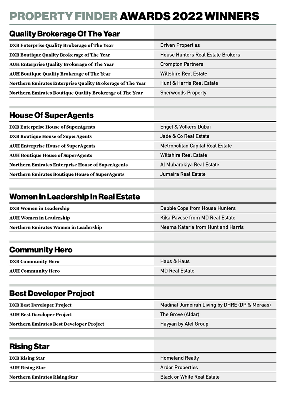 Home Industry Real Estate Property Finder Awards 2022: Honouring excellence, rewarding quality The awards recognised and celebrated top performers from UAE’s leading brokerage agencies and real estate developers by Gulf Business December 6, 2022 Follow us Follow on Google News Follow on Facebook Follow on Instagram Follow on X Follow on LinkedIn The ninth annual Property Finder Awards were held on November 10, at the prestigious Armani Hotel, Burj Khalifa. The awards ceremony was attended by 400 of the country’s most distinguished agents, representing over 40 brokerage agencies and real estate developers. The awards witnessed the presence of prominent thought leaders and decision-makers who’ve contributed to transforming the UAE’s real estate market into one of the most well-known sectors in the world. Michael Lahyani, CEO and founder of Property Finder, said: “Through Property Finder Awards, we are awarding the talents who contribute to making propertyfinder.ae a better experience for the millions of visitors who come to our website and app. Those who strive to produce high-quality listings with accurate information and unique pictures, hire agents with integrity and a passion for excellence, fight fake listings, and refuse to adhere to dishonest practices. We designed the event to boost consumer trust and credibility by motivating the industry to focus on quality.” Lahyani continued saying that 2022 has been a record-breaking year for the UAE’s real estate market. “Adding onto its incredible growth, the UAE is on an ongoing mission to attract more talent through its initiatives. The country is creating more opportunities for individuals and businesses in the real estate sector. This is why we have dedicated this year’s awards to the country that’s given us all so much and continues to give year on year – this wouldn’t have been possible without the wise leadership of the UAE.” Award categories Winners were announced across six unique award categories, emphasising best practices, technology and project excellence, as well as fostering the exchange of knowledge. Following an in-depth evaluation of a record number of entries across categories, the awards were divided into two categories – Boutique and Enterprise, to reflect on the true identity of the portal, which is “a marketplace for all”. The Property Finder judging panel reviewed the nominees and selected the winners based on the data and research collated, addressing home-seekers experiences. In a newly created category, ‘Women in Leadership,’ Property Finder awarded women-owned brokerages who deliver the highest quality in the industry based on critical quality metrics such as a number of verified listings, verified agents, and no tolerance for fake listings. The portal also awarded brokerages that deliver quality every year through ‘Quality Brokerage of the Year, in addition to other categories, including ‘House of SuperAgents,’ companies who lead the way with a high number of SuperAgents; ‘Best Developer Project,’ covering real estate projects that are unique, through innovation and architecture; ‘Community Hero,’ honouring those who give back to the community with the initiatives they have in place; and ‘Rising Star’ companies who have joined the platform last year and made great progress in growth and quality in such a short time. Some of the winners included Driven Properties, which won ‘Dubai Enterprise Quality Brokerage of The Year’; Madinat Jumeirah Living by DHRE (DP & Meraas) which was awarded ‘Dubai Best Developer Project’; Debbie Cope (Dubai) and Kika Pavese (Abu Dhabi) were awarded ‘Women in Leadership’ accolades, while Engel & Völkers Dubai won ‘Dubai Enterprise House of SuperAgents.’ Scott Bond, Property Finder UAE’s Country Manager, said: “Our mission at Property Finder is to empower property seekers to find their dream home. We can’t do that without the support and partnership of these brokers and developers. An award from Property Finder has become a status symbol that further validates the incredible hard work that brokers and developers all put in, and we’re honoured to play a small part in the success of the UAE real estate industry.” Tags Property Finder Awards 2022 Real Estate 0 Comments