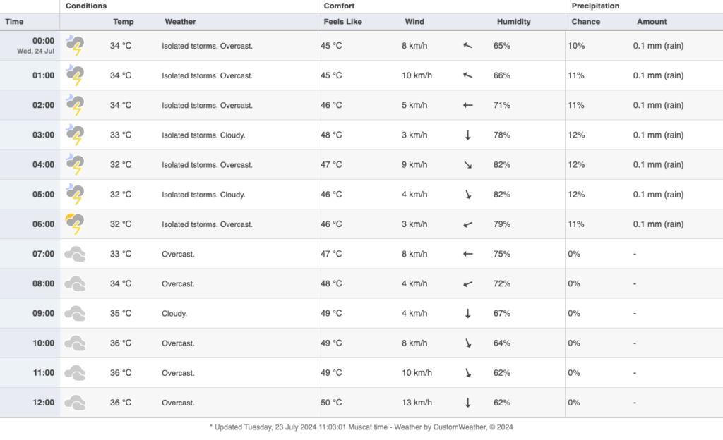 Home GCC Rain, flash flood alert issued for parts of Oman Oman’s capital Muscat is likely to see scattered rainfall in the early hours of June 24 with temperatures hovering in the mid-to-high 30s by Marisha Singh July 23, 2024 Follow us Follow on Google News Follow on Facebook Follow on Instagram Follow on X Follow on LinkedIn Image credit: Civil Aviation Authority of Oman Omani meteorology on Monday has issued a rain alert in the northern parts of the country. The Civil Aviation Authority (CAA) forecast scattered rain on July 23 and July 24 along with thunder and lightning, in parts of the Hajar Mountains and in the Dhofar Governorate. The warning was extended for areas such as Al Buraimi and South Al Batinah. The CAA said the forecast was based on the formation of cumulonimbus cloud activity as well as its indigenous model for the amounts of rain expected during the day. ⚠️تنبيه أمطار رعدية هطول أمطار متفرقة تكون رعدية أحيانًا مصحوبة برياح نشطة اليوم على أجزاء من جبال الحجر والمناطق المجاورة لها وعلى سواحل و جبال محافظة ظفار pic.twitter.com/vbrMZjRftW — الأرصاد العمانية (@OmanMeteorology) July 23, 2024 Parts of Oman such as the Wilayat of Al Hamra experienced heavy rainfall centred in the mountain villages in Jebel Shams triggering waterfalls and streams in the Wadi Al Nakhr, on Monday. Residents of Oman posted videos on social media, of heavy rain showers in areas such as Nizwa, Dakhiliyah. View this post on Instagram A post shared by Tourism Oman Tour guide (@oman_traveling) Disclaimer: The veracity of the video has not been verified. Furthermore, the rainy conditions will cover Oman’s capital Muscat, which is likely to see scattered rainfall in the early hours of June 24, with temperatures hovering in the mid-to-high 30s. Hourly forecast for June 24. Image credit: TimeandDate Read: Oman weather: Dhofar governorate to see thunderstorms, rain Tags Civil Aviation Authority (CAA) Oman rain