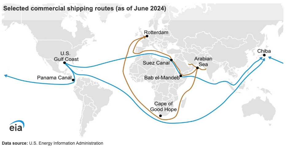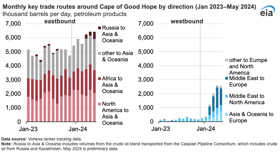 About 8.7 million barrels per day (bpd) of crude and refined products took the Southern Africa route in the first five months of 2024, from an average of 5.9 million bpd in 2023, with oil product volumes making up most of the increase, EIA said based on ship tracking data from Vortexa.