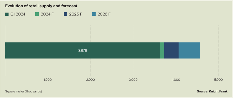 The existing retail space in Riyadh totals 3.6 million square metres, with an additional 27,050 square metres added in Q1 2024.