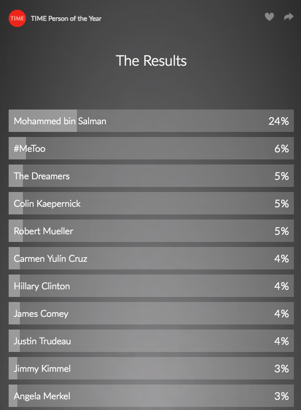 Home Industry Media Saudi Crown Prince voted Time person of the year The Crown Prince received significantly more votes than any other leader by Robert Anderson December 5, 2017 Follow us Follow on Google News Follow on Facebook Follow on Instagram Follow on X Follow on LinkedIn Saudi Crown Prince Mohammed Bin Salman has been voted Time magazine’s person of the year for 2017 in an online reader poll. The magazine wrote on Monday that the Saudi royal, who replaced former Crown Prince Mohammed bin Nayef as heir to the throne in June, received 24 per cent of the ‘yes’ votes cast. Read: Saudi appoints Mohammed bin Salman as Crown Prince He was followed by people who shared their experiences with sexual assault and harassment under the #metoo movement with 6 per cent of votes. Former San Francisco 49ers quarterback Colin Kaepernick, special counsel Robert Mueller and the Dreamers, undocumented immigrants who were brought to the US as children, received 5 per cent of the votes each. Other prominent figures on the list included former US presidential candidate Hillary Clinton, former director of the FBI James Comey and Canadian Prime Minister Justin Trudeau with 4 per cent each. The Saudi Crown Prince has made headlines recently after spearheading a corruption crackdown that has snared high profile businessman, royals and ministers. Read: Saudi expects to recover up to $100bn from corruption settlements Prior to this, he was known as the face of the kingdom’s reform plan – Vision 2030 – after promising to end its “addiction” to oil. Read: In depth: Saudi prince unveils plans to end “addiction” to oil Some have speculated that current monarch King Salman could be preparing to abdicate to allow the ambitious Crown Prince to take his place. Read: Saudi king has no plans to abdicate for crown prince – report The editors of Time magazine select their ultimate person of the year as the individual they believe wielded the most influence in the previous 12 months. US President Donald Trump was declared Time person of the year for 2016 ahead of his inauguration and attracted controversy last month when he claimed to have taken a “pass” on an interview and “major photo shoot” with the publication after he said he was told he would likely be person of the year again. Time later said the president was incorrect and it would not comment on its choice until December 6. 0 Comments