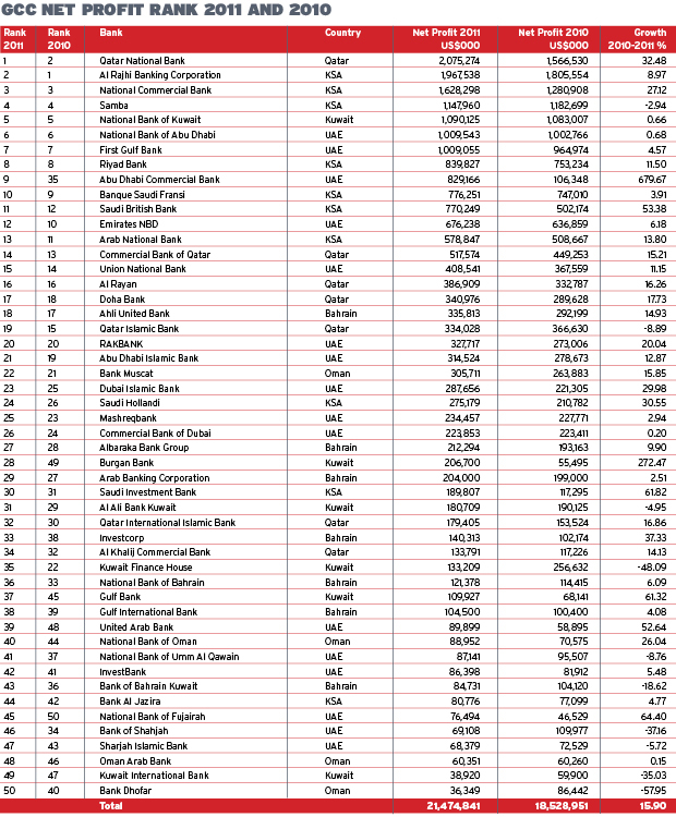 Home Insights Analysis Top GCC Banks By Profits Higher GCC banking profitability was driven by improvement in margins, faster asset expansion and expanding fee income in 2011. by Darren Stubing August 23, 2012 Follow us Follow on Google News Follow on Facebook Follow on Instagram Follow on X Follow on LinkedIn Net profit for the top 50 GCC banks increased for the second consecutive year in 2011. The region’s largest banks achieved a good increase of 15.9 per cent last year following an improvement of 15.1 per cent in 2010. Significant improvement in terms of net profit was seen at a number of banks, and across a number of countries, including Qatar National Bank, Abu Dhabi Commercial Bank, National Commercial Bank, Saudi British Bank, Dubai Islamic Bank, Burgan Bank, Saudi Investment Bank, Gulf Bank, United Arab Bank and National Bank of Fujairah. The financial positions of nearly all GCC 50 banks strengthened in 2011 with maintained good capital adequacy, helped by higher profits, and slightly higher liquidity. 0 Comments