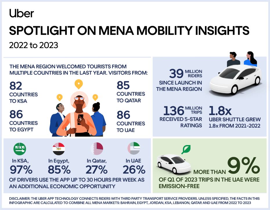 Home Technology Mobility Tourists from over 80 countries visited MENA region in 2022, reveals Uber The latest insights revealed that the number of sustainable trips in the UAE doubled with over 9 per cent of trips requested in Q1 2023 being emission-free by Neesha Salian April 3, 2023 Follow us Follow on Google News Follow on Facebook Follow on Instagram Follow on X Follow on LinkedIn Uber’s latest data-driven insights on mobility in the MENA region showed the impact of ridesharing on tourism, economic growth, and the road toward more sustainable transportation. According to the mobility as a service/ride-hailing provider, the MENA region witnessed significant growth, especially during 2022. During the last period, the region became a very attractive destination to host mega events like the World Cup in Qatar, which further attracted more tourists from all around the world. Uber’s insights showed that tourists from more than 80 different countries visited the MENA region in the past year, specifically: 86 in Egypt, 82 in Saudi Arabia, 86 in the UAE, and 85 in Qatar. Read: Uber transports 2.6 million riders across Qatar during FIFA World Cup The impact of increased tourism and public-private collaboration for mega-events also reflected positively on drivers’ earnings. The data also showed the continuous need for flexible economic opportunities that enable drivers to attend to other commitments and have multiple flexible sources of earnings, especially during the current challenging global macroeconomic conditions. Out of all drivers who use the platform, 85 per cent in Egypt, 97 per cent in Saudi Arabia, 26 per cent in the UAE, and 27 per cent in Qatar drive less than 30 hours per week using the Uber platform as an additional economic opportunity. Frans Hiemstra, MEA regional director, and general manager for Uber said, “MENA is one of our key regions that contribute to the business globally with its potential to welcome innovative technologies. “Our vision for the region is focused on three main pillars: to provide all riders using our platform who just reached 39m since launching in MENA with diverse options that would make their travel more seamless; to support drivers during these unprecedented times by creating new opportunities for additional earnings; to contribute to the wider goal of making our planet greener as per our global 2040 commitment to make our platform emissions-free. “Today, we are proud to share key 2022-2023 milestones that have contributed to this vision so far.” Uber to offer more sustainable trips to riders Over the last years, the provider has offered more sustainable options in the UAE and Jordan to give riders the ability to request a trip via the app using a fully electric vehicle under the UberGreen option and has made its first commitment in the region in 2022. It aims to have one in four trips (25 per cent) in the UAE be emissions-free by 2030. The latest insights revealed that the number of sustainable trips has doubled as more than 9 per cent of Q1 of 2023 trips requested through the platform in the UAE were emission-free. “This is just a start. We need to continue the dialogue and collaboration to accelerate expanding this transition across all countries in our region. We are ready to provide our know-how and technology to do the right thing for our planet and for making the world a better place for the next generation,” added Hiemstra. Charging infrastructure is a key barrier for rideshare drivers going electric.@bp_plc & Uber have signed a new deal using their global footprints to provide access to reliable & convenient charging, at ultra-fast speeds, helping drivers transition to EVs. (Link in bio) pic.twitter.com/TAfExG3rg9 — Uber (@Uber) March 31, 2023 Since its launch in the MENA region, Uber has been investing efforts in improving the user experience on the app. This resulted in over 136 million trips requested through the platform across MENA receiving a five-star rating, according to the provider. It also launched multiple global-firsts in the region, such as the daily mass-transport commute product, UberShuttle, which saw growth of 1.8x from 2021 to 2022 in Egypt and expanded to launch yet another global-first B2B service in 2022. In other news, in January, the provider entered a strategic partnership with Dubai Airports to improve the on-ground commute experience of riders once they arrive at Dubai International Airport. Read: Uber, Dubai Airports to enhance visitors’ on-ground commute experience Uber has also launched its latest innovative travel feature, Smart Itineraries. Once riders link their Uber profiles with their Google account by clicking on ‘Travel’ in the app, it displays upcoming travel plans and allows people to reserve an Uber to and from specific locations based on hotel and flight bookings, making the travel experience even more seamless. Tags Insights MENA mobility transport Travel Uber 0 Comments