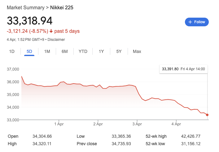 Home News Trump tariffs jolt Tokyo: Stocks on track for worst week in 5 years The Nikkei index was down 3.6 per cent at 33,474.56, and on course for a weekly decline of nearly 10 per cent by Reuters April 4, 2025 Follow us Follow on Google News Follow on Facebook Follow on Instagram Follow on X Follow on LinkedIn Image credit: Getty Images Japanese stocks sank on Friday to their lowest levels since last August, and were set for their sharpest weekly drop in five years, as fears of a global recession in the wake of US President Donald Trump’s sweeping tariffs gripped markets. As of 0420 GMT, the Nikkei index was down 3.6 per cent at 33,474.56, and on course for a weekly decline of nearly 10 per cent, if losses hold. The broader Topix fell 4.6 per cent to 2,448.94, poised for a weekly drop of 11 per cent. Both indexes were set for their steepest weekly losses since March 2020. The brutal selloff came after Trump announced on Wednesday Washington’s steepest trade barriers in more than 100 years, sending investors scrambling for safe-haven assets, including the yen, which added further pressure on Japanese stocks. The rout was led by banking stocks as the spectre of tariffs and their potential impact on economic growth stoked speculation that the Bank of Japan may need to delay rising interest rates. Read more: Full list: Trump’s tariffs on every country, including the UAE, Saudi Japanese bank shares recently gained popularity among investors betting on rising BOJ interest rates. All but three of the Tokyo Stock Exchange’s 33 industry sub-indexes dropped on Friday, with the banking index down 11 per cent, making it the worst performer and triggering a circuit breaker. The banking index was on track for a decline of more than 20 per cent this week, its worst weekly performance on record. Shares of Mitsubishi UFJ Financial Group, one of Japan’s biggest banking groups, fell 11.6 per cent and were set for their biggest one-day drop since August 5. “Banks in Japan are caught in the crossfire of waning rate-hike expectations coinciding with the market coming to terms with increased chances of a global recession,” said Jon Withaar, who manages an Asia special situations hedge fund at Pictet Asset Management. Read more: Global markets reel as Trump slaps sweeping tariffs BOJ Governor Kazuo Ueda said that the central bank will scrutinise the impact of US tariffs on the country’s economy when setting monetary policy, warning the higher levies will likely weigh on global and domestic economic growth. Wall Street benchmarks slumped on Thursday, ending with the largest single-day percentage losses in years. S&P 500 companies lost a combined $2.4 trillion in stock market value. Takamasa Ikeda, senior portfolio manager at GCI Asset Management, said the Nikkei has “double headwind – the tariff and the stronger yen” and could fall to as low as 32,000 this month. Tags Tariffs Trump trump tariffs