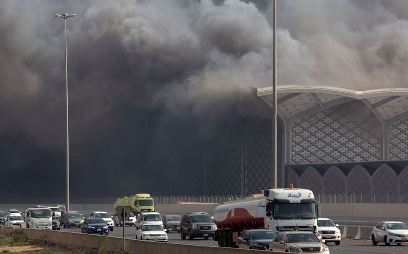 Videos posted to social media showed huge plumes of black smoke billowing out of the Haramain train station in Jeddah. Videos also showed firefighters – and firefighting helicopters – desperately trying to contain the blaze as at least a dozen people could be seen on the roof.