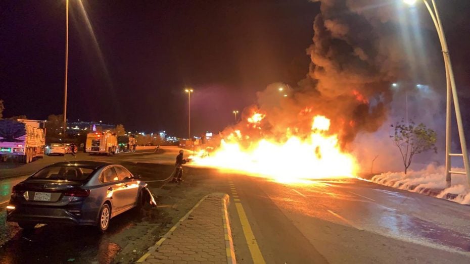 Home GCC Saudi Arabia Video: Massive fire on Makkah-Jeddah highway after tanker accident The blaze did not cause any injuries and was brought under control on Tuesday morning by Staff writer August 24, 2021 Follow us Follow on Google News Follow on Facebook Follow on Instagram Follow on X Follow on LinkedIn A massive fire that broke out at the Makkah-Jeddah highway late on Monday was brought under control early on Tuesday, officials have confirmed. The blaze erupted after a petroleum tanker was involved in a road accident. Civil Defences forces in Makkah confirmed on early on Tuesday that the tanker and 10 vehicles caught fire, but added that there were no injuries. A video posted to the Makkah region’s official Twitter account showed the fire stretching across the side of the highway. While cars are seen driving by, vehicles were later diverted from the highway. #الدفاع_المدني:تمت السيطرة على حريق طريق مكة -جدة السريعنتج عنه احتراق الناقلة و 10 مركبات ، دون وقوع إصابات . https://t.co/iqEOTO4EGG — إمارة منطقة مكة المكرمة (@makkahregion) August 23, 2021 Tags accident fire Makkah-Jeddah Highway News Saudi Arabia Tanker 0 Comments