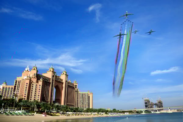 The aerial showcase featured 11 aircraft including a Boeing 737 Max 8 from Flydubai, an Airbus A320 from Air Arabia, an Airbus A380 from Etihad, an Airbus A380 from Emirates and seven Al Fursan aerobatic display jets from the UAE Air Force.